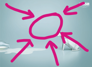 In this piece, the tissue cat is in contrast to the rest of the piece and the fact that it appears to be looking toward the spilled milk draws attention to the overall message which is that tissue paper (whether in cat form or not) soaks up spills!