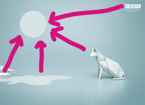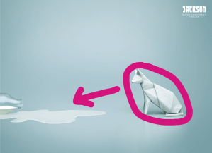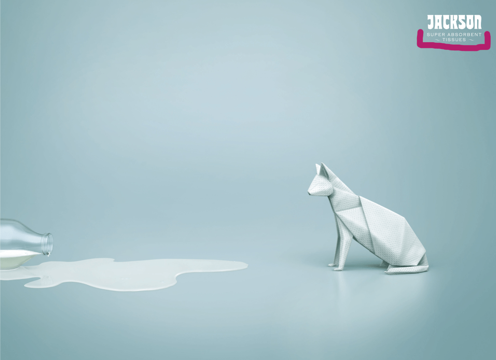 This is an advertisement for Jackson Super Absorbent Tissues and it was created by FCB Ulka. As described on Paintbox.In, the design was created digitally, however, mock-ups were made using real tissues to try and mimic the way that the tissues would look if they were folded up. The advertisement is appealing in its simple design and its use of origami as a jump-off point.